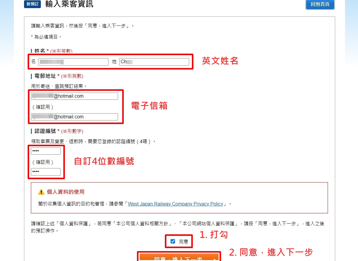 - 輸入訂購人的英文姓名、電子信箱、自訂的4位數認證編號(領取車票、變更、退款時使用)