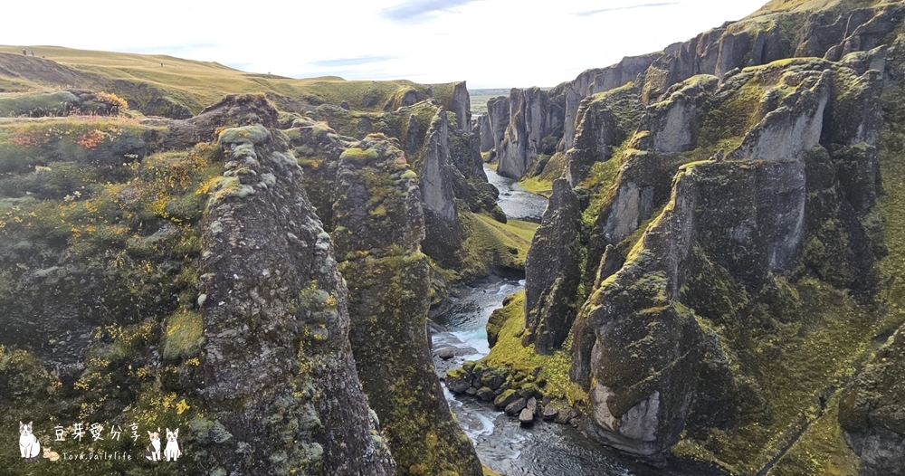 高空俯瞰的「羽毛河峽谷 Fjaðrárgljúfur」形狀如同一根羽毛,雖然算是冰島南部相對小眾的景點,但羽毛河峽谷的岩壁陡峭又蜿蜒,岩壁中有洩流而下的瀑布、岩壁上覆蓋著綠色的植披,谷底則有河流順流而下,是非常壯闊的天然美景,讓人不禁讚嘆大自然的鬼斧神工。若時間許可,不妨留點時間給羽毛河峽谷吧!