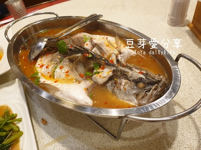 是一整隻的鱸魚,有稍微切開攤平,讓魚肉全部浸在湯汁裡面,這樣會比較入味,